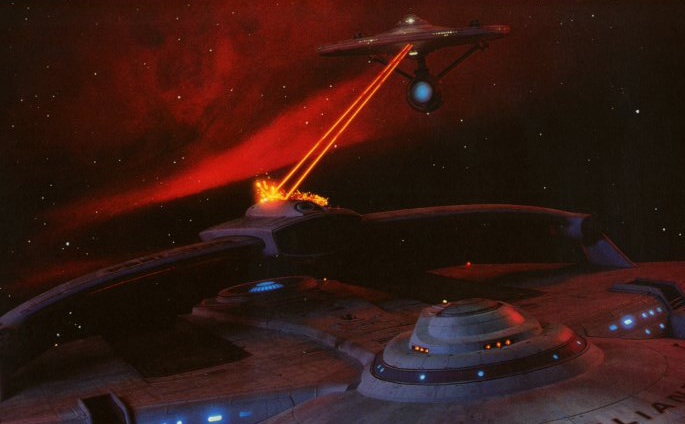 | The U.S.S. Enterprise (top) fires on the U.S.S. Reliant in Star Trek II: The Wrath of Khan. Image © 1982 Paramount Pictures, |