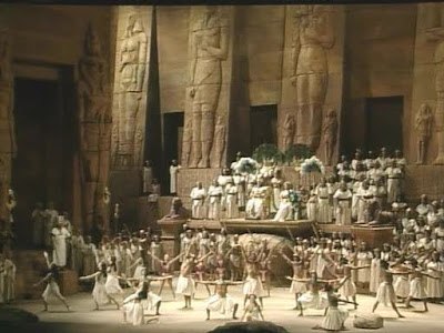 Ring continues in the same bizarre vein as the first. Once more, effective use is made of the "grid" background, providing lighting accents and color during the second act. The tree-image is also crucial to this opera--Wotan' outburst of "Das Ende!" causes an enormous branch of the rotting wood to smash down onto the stage. For the "Ride of the Valkyries," the wall opens two Valhalla-sized doors, through which the diapered corpses of the dead warriors walk on their way to the afterlife.