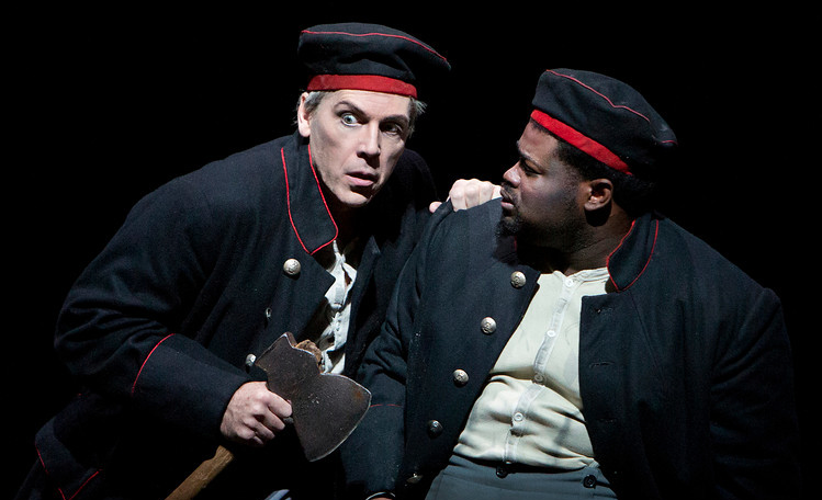Matthias Goerne (left) emotes as Jaap van Zweden (on podium) leads the New York Philharmonic. Photo by Chris Lee © 2019 The New York Philharmonic. |
