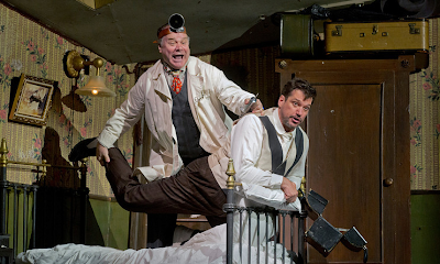 | The Doctor (Gennady Bezzubenkov) administers to the nose-less Kovalyov in a scene from The Nose. Photo by Ken Howard © 2013 The Metropolitan Opera. |