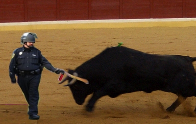 Photo amalgamation by the author, who does not endorse bullfighting or pepper spray.