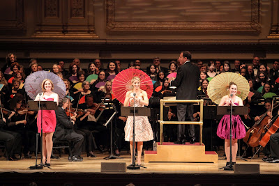 Huge vases of cherry blossoms stood at either end of the Carnegie Hall stage on Tuesday night. The plain white plaster panels at the back of that famous stage were adorned with a projection of Mount Fuji. The Collegiate Chorale was in place, behind the American Symphony Orchestra.
