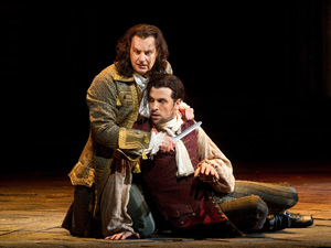 "Nobody move or the baritone gets it!" Peter Mattei as Don Giovanni (with knife) threatens Luca Pisaroni's Leporello. Photo by Marty Sohl © 2011 The Metropolitan Opera. |