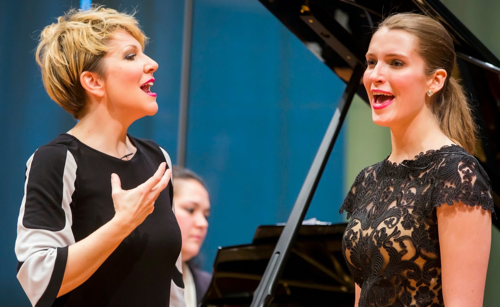 | Joyce DiDonato gives pointers to mezzo Kayliegh Decker (right) at Saturday's master class. Photo by Chris Lee © 2015 courtesy Carnegie Hall. |